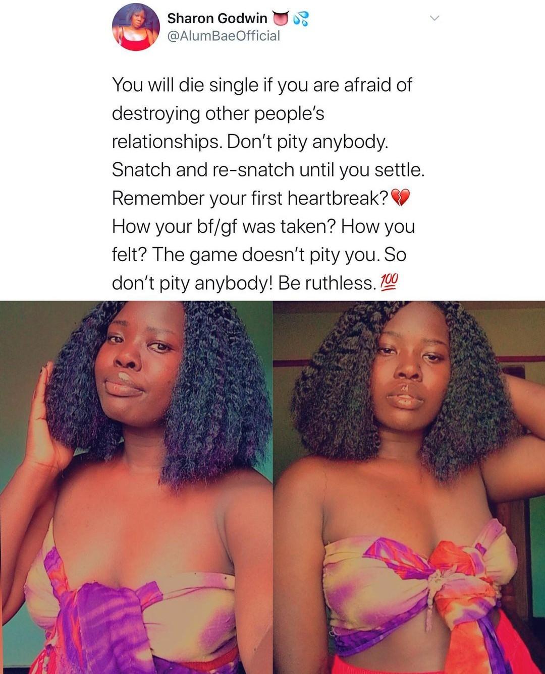 “You will die single if you are afraid of destroying other people’s relationships. Don’t pity anybody. Snatch and re-snatch until you settle. Remember your first heartbreak?? How your bf/gf was taken? How you felt? The game doesn’t pity you. So don’t pity anybody! Be ruthless.”