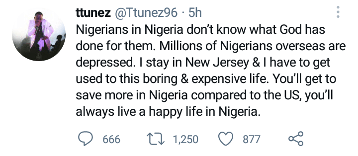 “Nigerians in Nigeria don’t know what God has done for them. Millions of Nigerians overseas are depressed. I stay in New Jersey & I have to get used to this boring & expensive life. You’ll get to save more in Nigeria compared to the US, you’ll always live a happy life in Nigeria.”