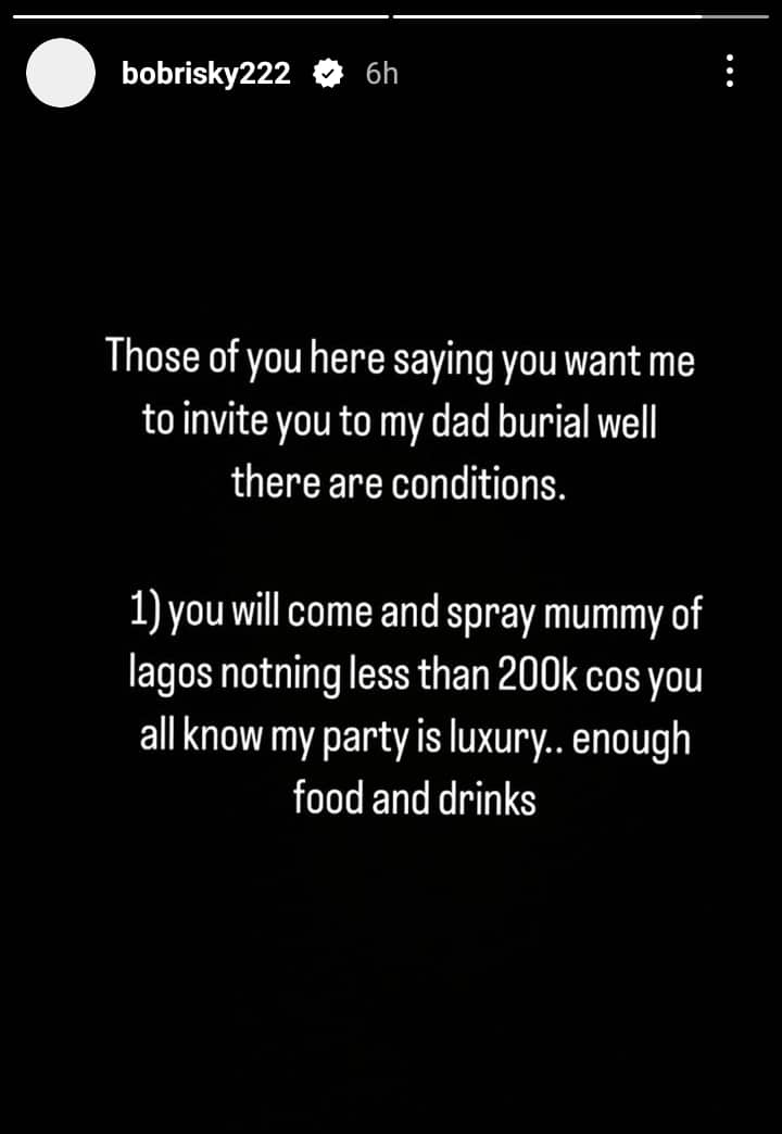Controversial crossdresser, Bobrisky has released the list of condition for those who want to attend the burial ceremony of his father.