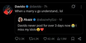 Davido, who tied the knot with Chioma a month ago in a flamboyant Miami ceremony, has been less visible online since the wedding. This quietness didn’t go unnoticed by a fan identified as Abazz, who asked him on X why he no longer posts like he used to.