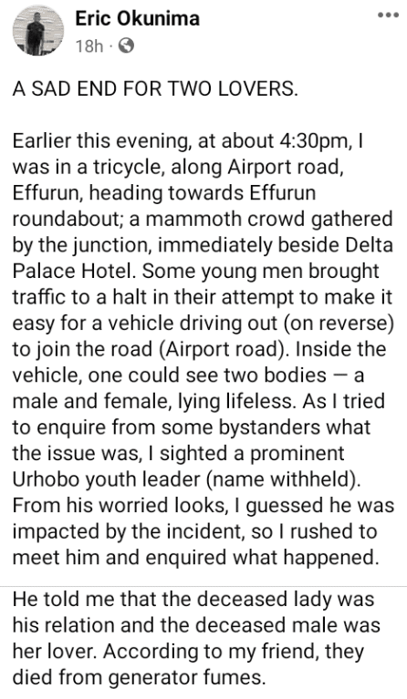 A young Nigerian couple has tragically met their end in Ugborikoko Community, Uvwie Local Government Area of Delta State, as a result of inhaling generator fumes.