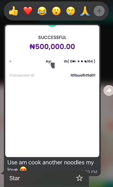 A young lady has reportedly received an alert of 500,000 naira from her boyfriend to cook another noodles after the first one got burnt.