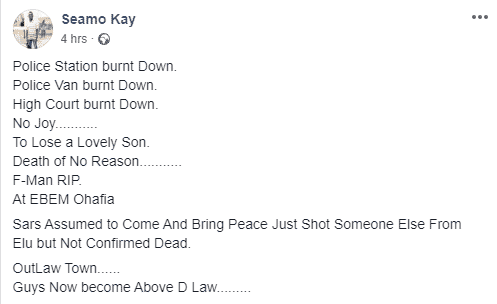 “The situation was not helped by the news that two indigenes of Abia State had already lost their lives due to the COVID-19 lockdown. So, far a police patrol, police station and customary court at Ebem-Ohafia were all torched.