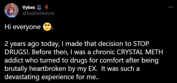 “Hi everyone 🥺. 2 years ago today, I made that decision to STOP DRUGS!. Before then, I was a chronic CRYSTAL METH addict who turned to drugs for comfort after being brutally heartbroken by my EX. It was such a devastating experience for me,” he wrote.