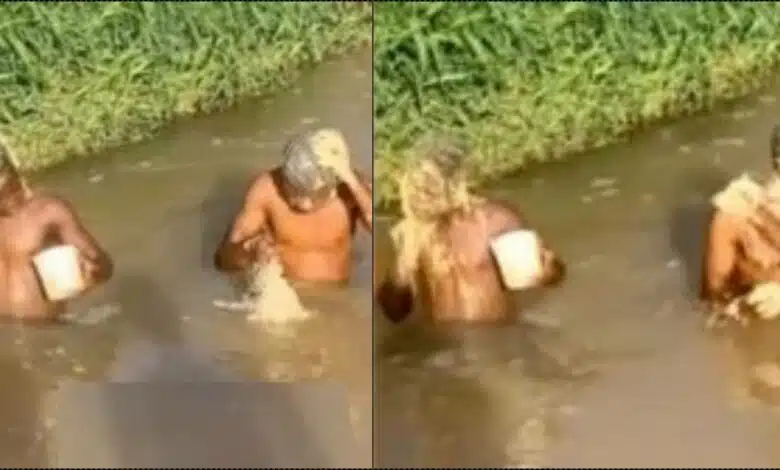 Two young men suspected to be Yahoo boys seeking favour in the “Yahoo Yahoo” business were observed bathing in a river with a special soap.