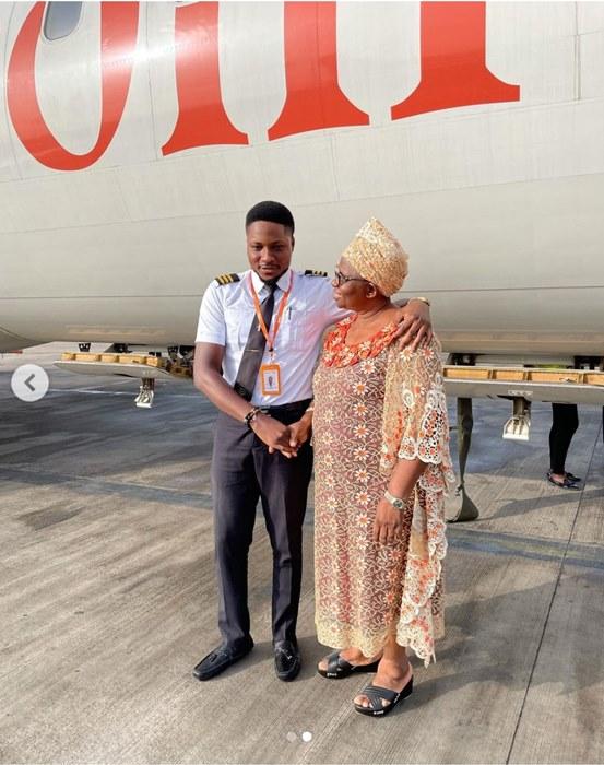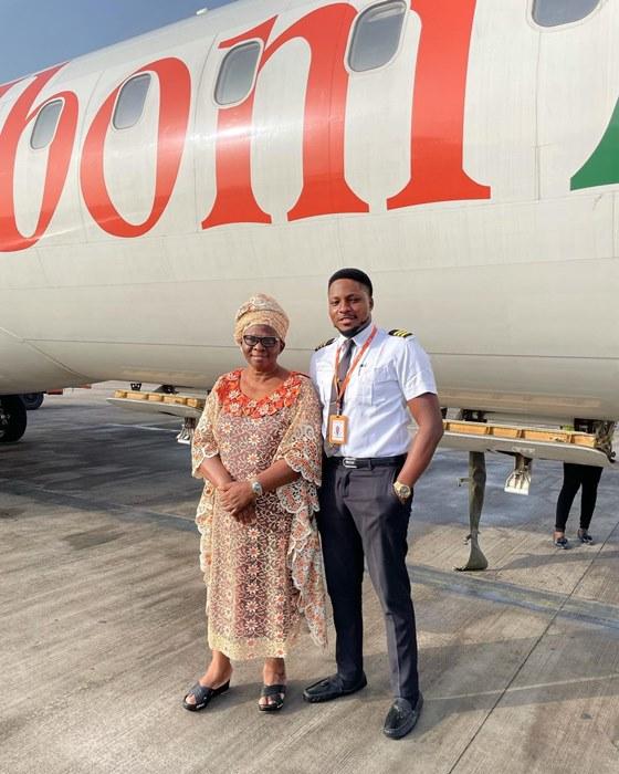 A Nigerian pilot celebrates after flying his mother to her destination for the first time.