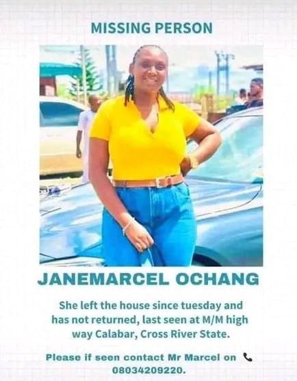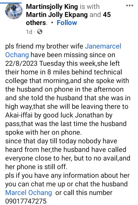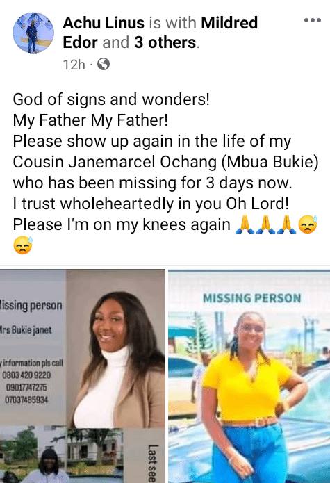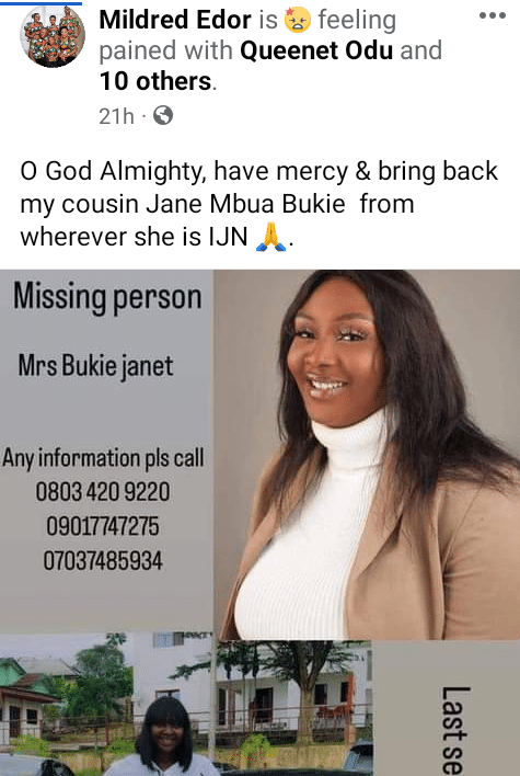 The family of a woman identified as Mrs. Janemarcel Ochang, also known as Mbua Bukie, is grappling with worry following her sudden disappearance in Calabar, the capital city of Cross River State.