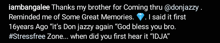 He wrote: “Thanks my brother for coming through. Reminded me of some great memories. I said it first 16 years ago “It’s Don Jazzy again”. God bless you bro.”