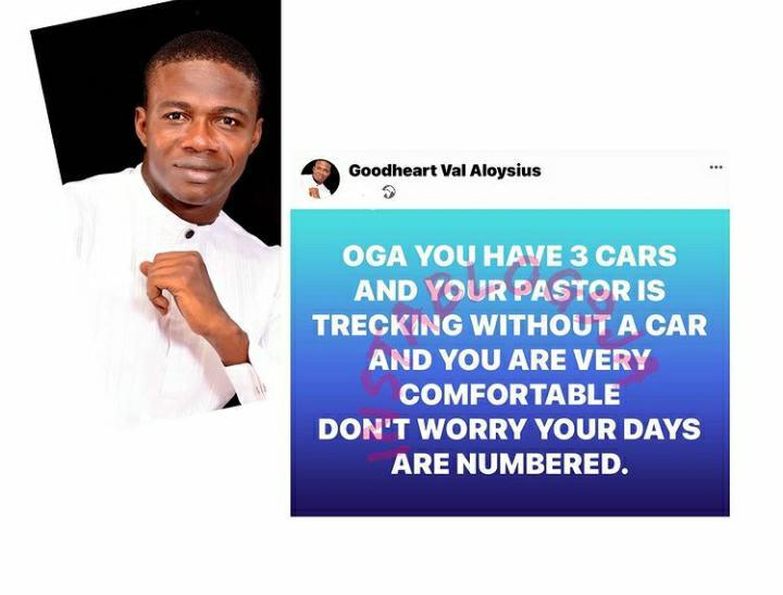 “Oga you have 3 cars and your pastor is trekking without a car and you are very comfortable don’t worry your days are numbered.”