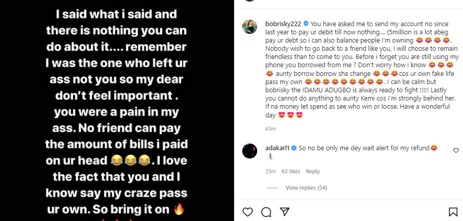 Lastly you cannot do anything to aunty Kemi cos I’m strongly behind her. If na money let spend as see who win or loose. Have a wonderful day 😍😍😍”