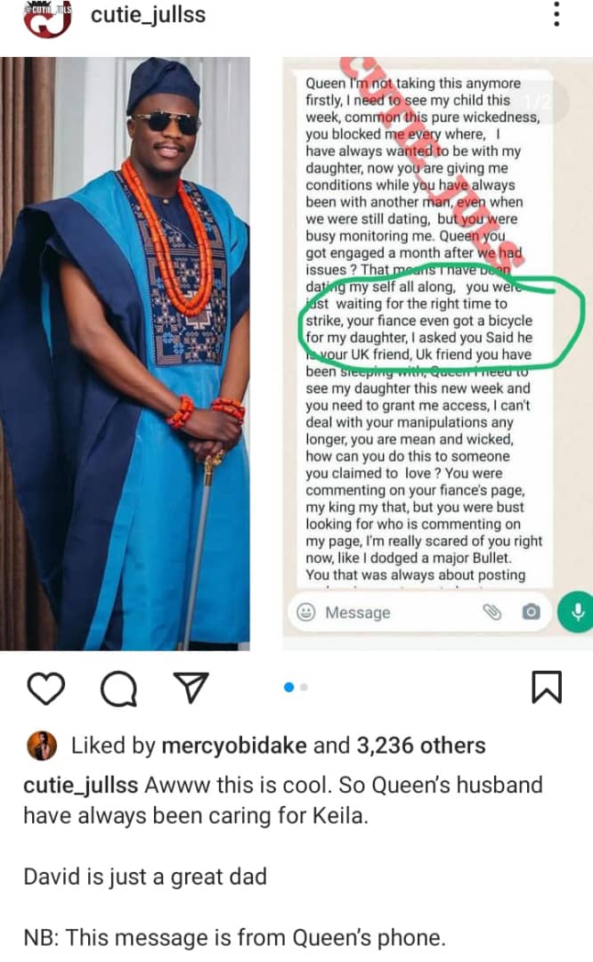 “Queen I’m not taking this anymore firstly, I need too see my child this week. common this is wickedness. You blocked me everywhere. have always wanted. I have always wanted to be with my daughter, now you a giving me conditions While you have always been with another man, even when we were still dating, but you busy monitoring me. Queen you got engaged a month after we had issues ? That means I have been dating my self all along. you were just waiting for right time to strike, your fiance even got a bicycle for my daughter. I asked you Said he is your UK friend. uk friend you have been sleeping with, Queen I need to see my daughter this new week and you need to grant me access. I cant deal with your manipulations any longer. you are mean and wicked. how can you do this to someme you claimed to love ? You were commenting on your fiance’s page. my king my that, but you were bust looking for who is commenting on my page, rm really scared of you right now. like I dodged a major Bullet. You that was always about posting…”