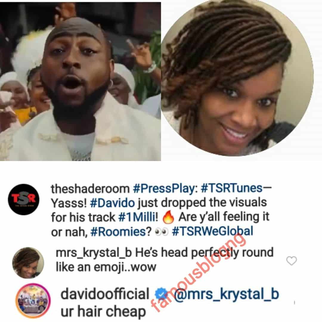 She described his head as shaped “perfectly round like an emoji”. Davido wasn’t going to let the comment slide as he immediately responded, calling her hair “cheap”.