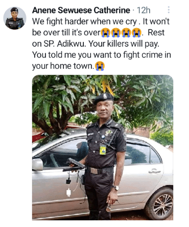 “We fight harder when we cry. It won’t be over till it’s over . Rest on SP Adikwu. Your killers will pay. You told me you want to fight crime in your hometown,” she wrote.