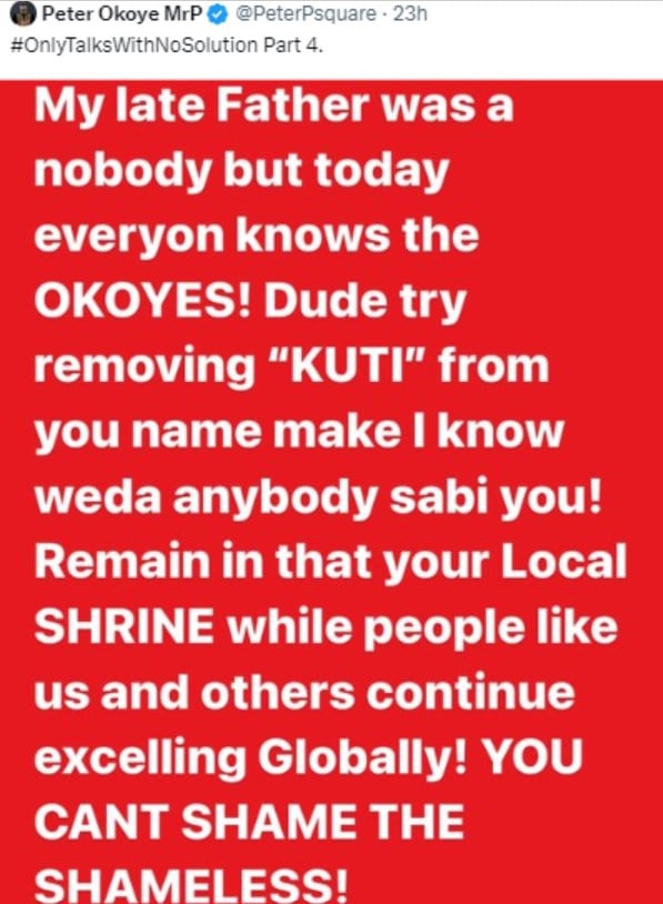 In response to Seun’s statement, Peter Okoye, lambasted him in a series of posts, claiming that he would be a nobody if he removes his father’s name “Kuti” from his name.