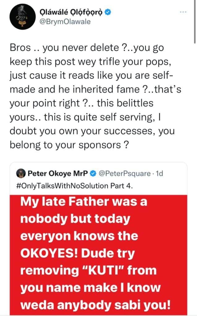 Brymo tweeted, “Bros .. you never delete ?..you go keep this post wey trifle your pops, just cause it reads like you are self-made and he inherited fame ?..that’s your point right ?.. this belittles yours.. this is quite self serving, I doubt you own your successes, you belong to your sponsors?”