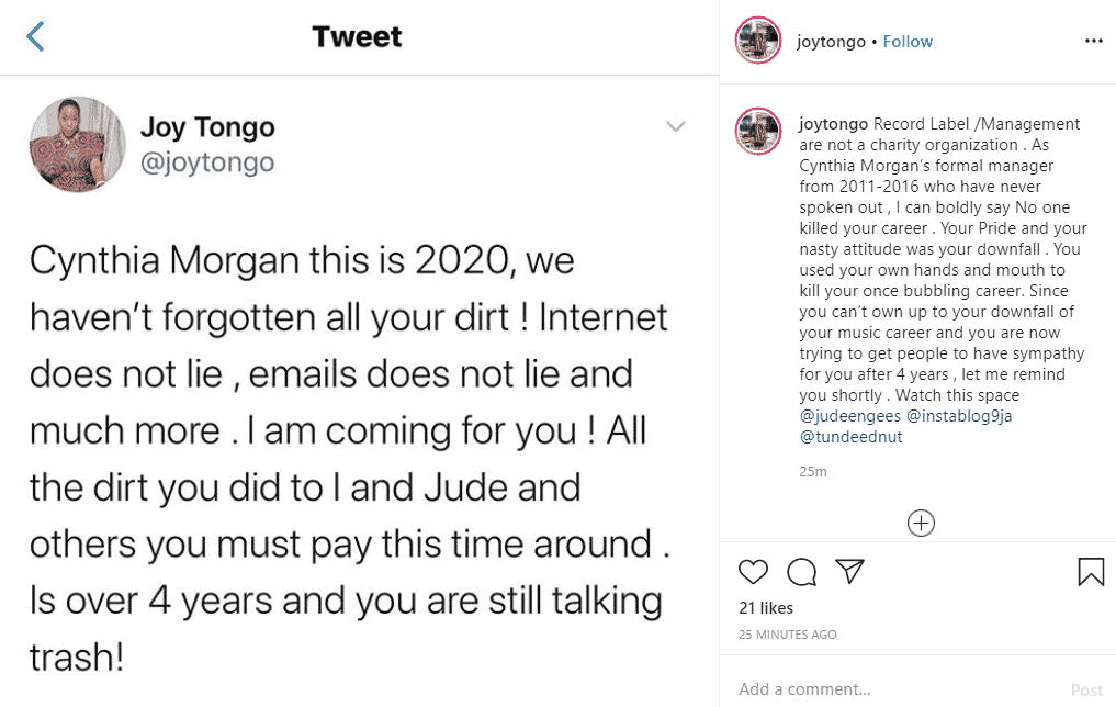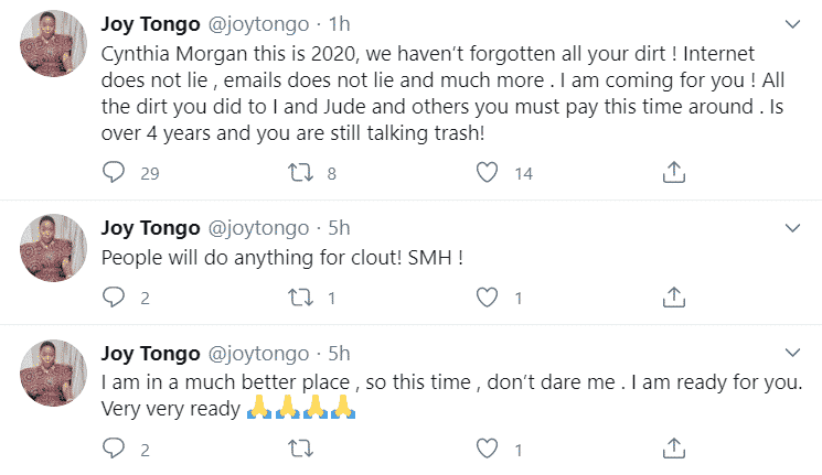“Cynthia Morgan this is 2020, we haven’t forgotten all your dirt ! Internet does not lie , emails does not lie and much more . I am coming for you ! All the dirt you did to I and Jude and others you must pay this time around . Is over 4 years and you are still talking trash!”