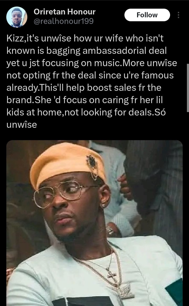 “Kizz, it’s unwîse how ur wife who isn’t known is bagging an ambassadorial deal yet u just focusing on music. More unwîse not opting fr the deal since u’re famous already. This’ll help boost sales fr the brand. She‘d focus on caring for her little kids at home, not looking for deals. Só unwîse”