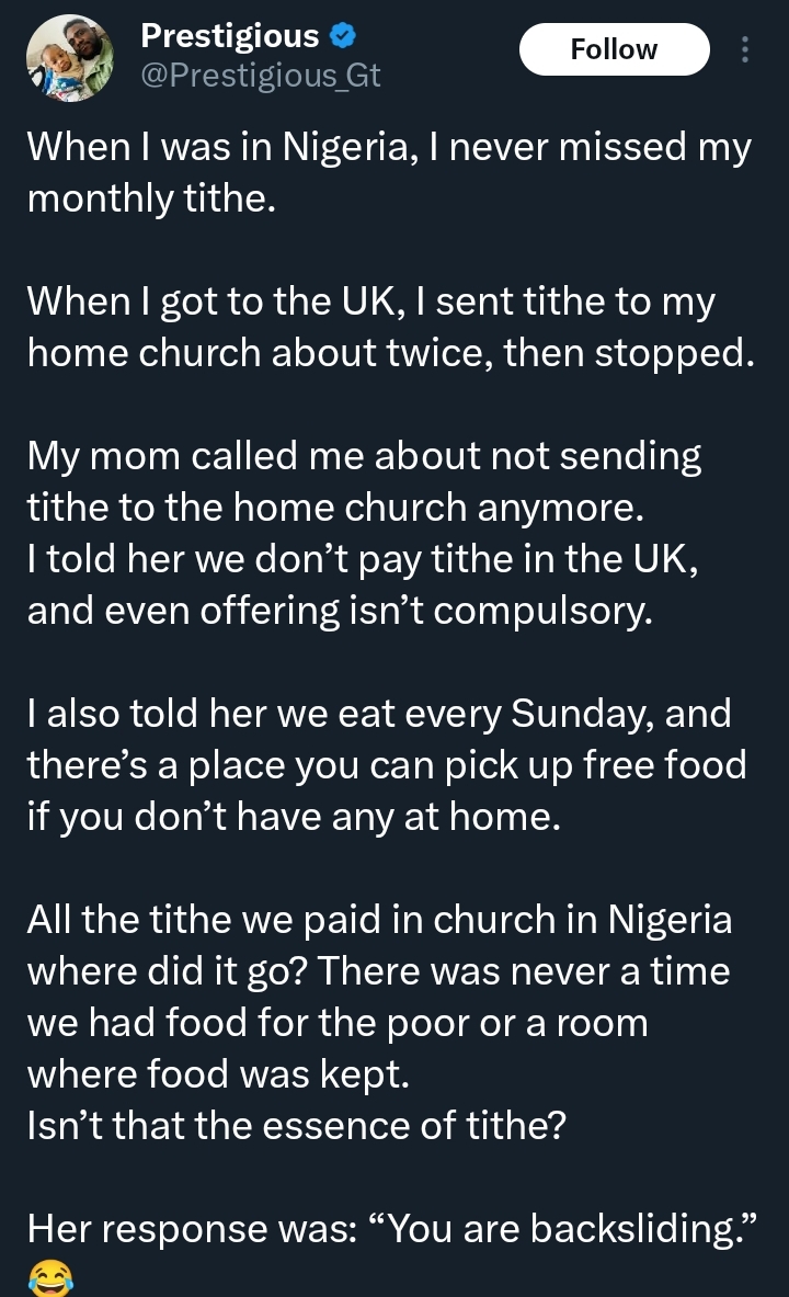 In a heartfelt message shared online, he explained that while he faithfully paid his monthly tithe in Nigeria, his contributions significantly reduced after moving to the UK.