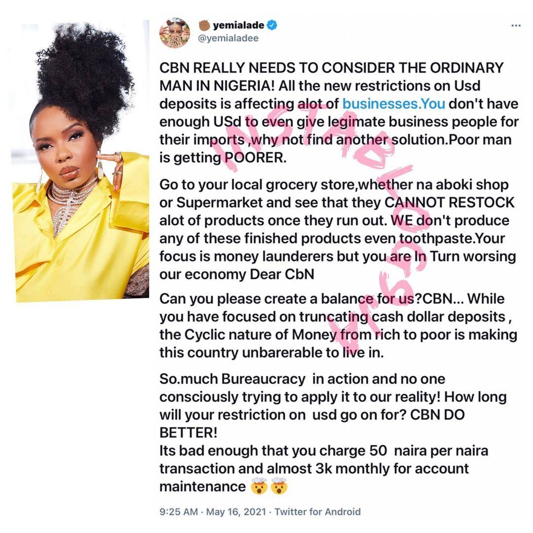 Yemi Alade in a series of tweets on her official Twitter account slammed the apex bank, urging them to stop placing their focus on money laundering.