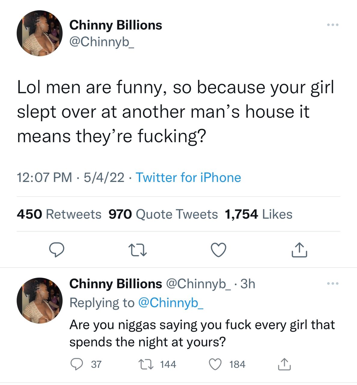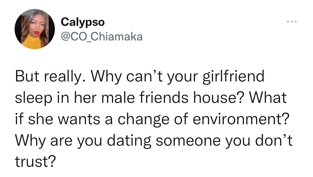 In a tweet, the lady affirmed that any man who has a problem with his girlfriend sleeping over at her male friend’s place is simply over-possessive and insecure.