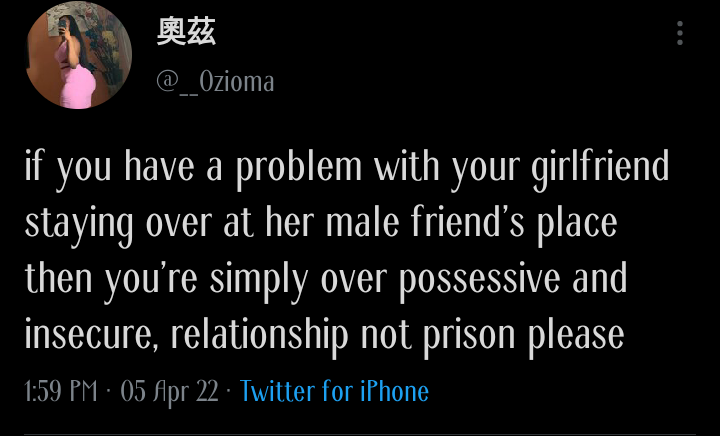 “if you have a problem with your girlfriend staying over at her male friend’s place then you’re simply over possessive and insecure, relationship not prison please,” she wrote.