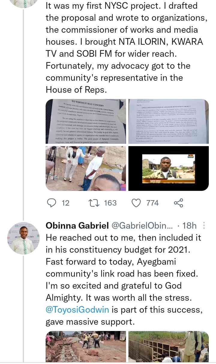 Obinna Gabriel, a Youth Corper doing his one year mandatory service in Kwara state, has described how he brought a road development project to a Kwara community.