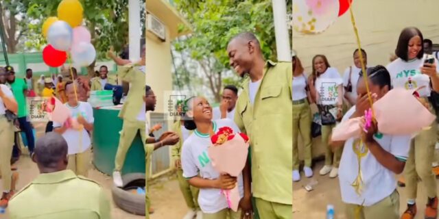 A youth corps member serving at the Abuja NYSC camp caused a buzz on social media as he went down on one knee to propose to his girlfriend.