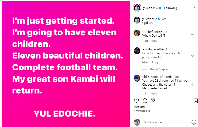 “I’m jsut getting started. I’m going to have eleven children. Eleven beautiful children. Complete football team. My great con Kambili must come back,” Yul posted.
