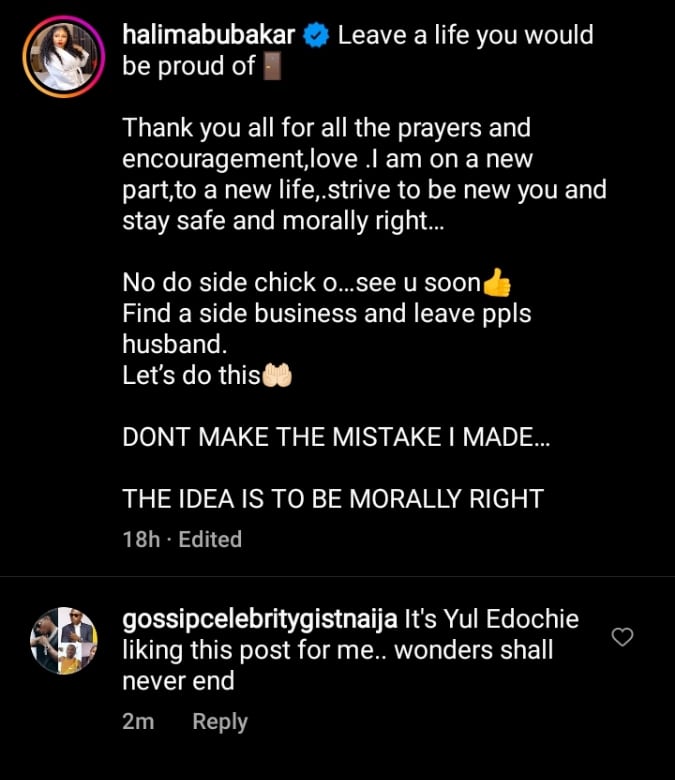 Yul Edochie is one of the people who reacted to the post of Halima Abubakar. A fan who noticed commented under Halima’s post, “It’s Yul Edochie liking this post for me.. wonders shall never end”; a subtle shade to shade for picking a second wife.