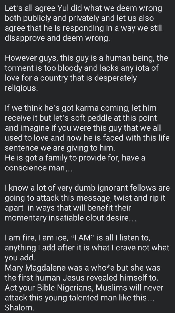 In his words: “Let’s all agree Yul did what we deem wrong both publicly and privately and let us also agree that he is responding in a way we still disapprove and deem wrong.