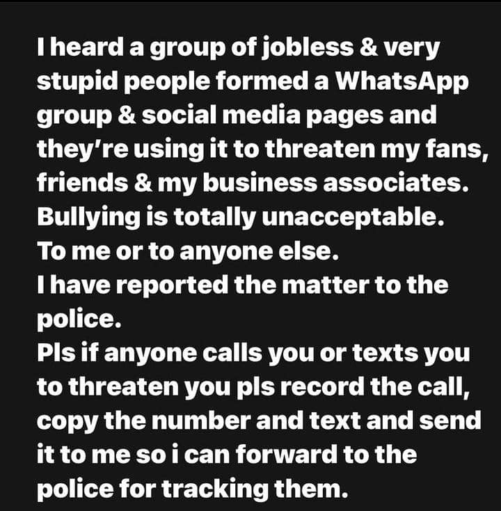 In his words: “I heard a group of jobless & very stupid people formed a WhatsApp group & social media pages and they’re using it to threaten my fans, friends & my business associates. Bullying is totally unacceptable. To me or to anyone else. I have reported the matter to the police. Pls if anyone calls you or texts you to threaten you pls record the call, copy the number and text and send it to me so i can forward to the police for tracking them.