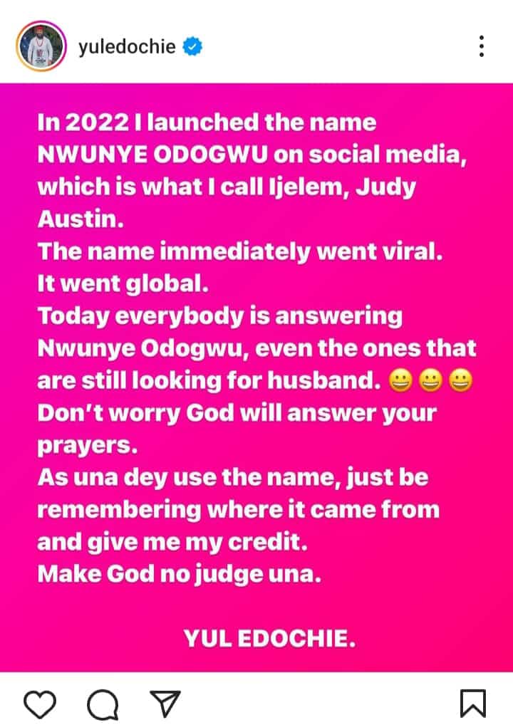 “In 20221 launched the name NWUNYE ODOGWU on social media, which is what I call Ijelem, Judy Austin. The name immediately went viral.