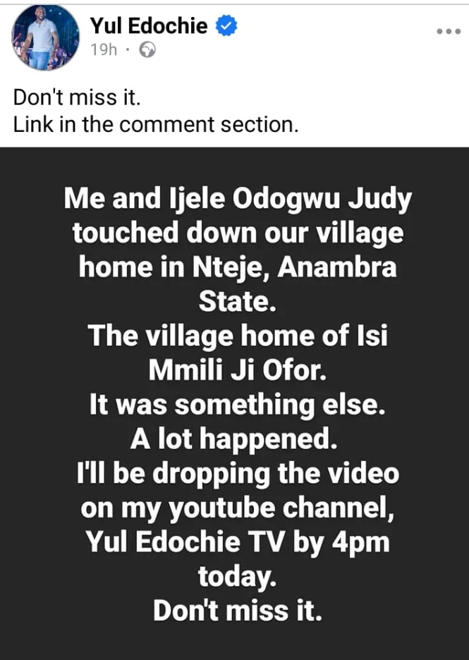 “Me and ljele Odogwu Judy touched down our village home in Nteje, Anambra State. The village home of Isi Mmili Ji Ofor. It was something else. A lot happened. I’ll be dropping the video on my YouTube channel, Yul Edochie TV by 4 pm today.