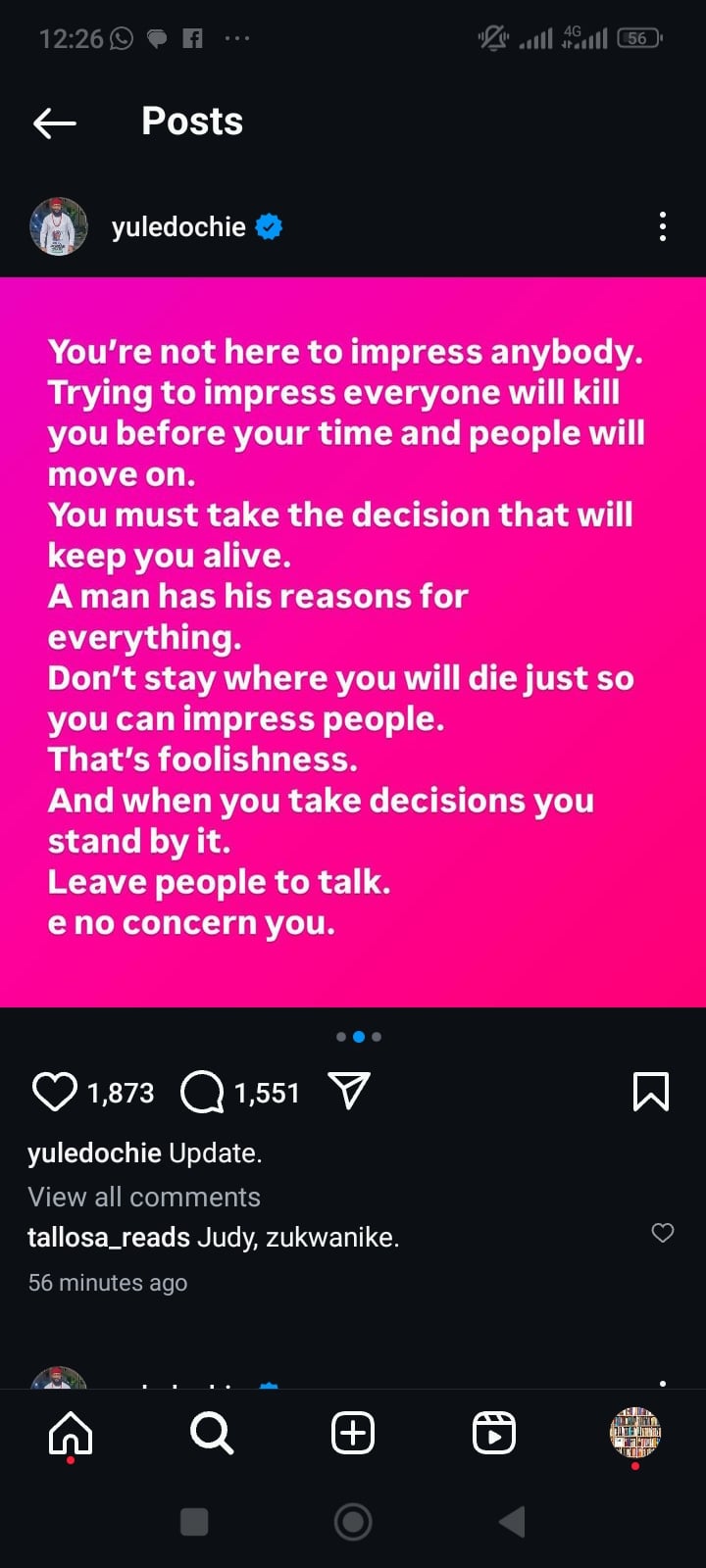 You’re not here to impress anybody. Trying to impress everyone will kill you before your time and people will move on.