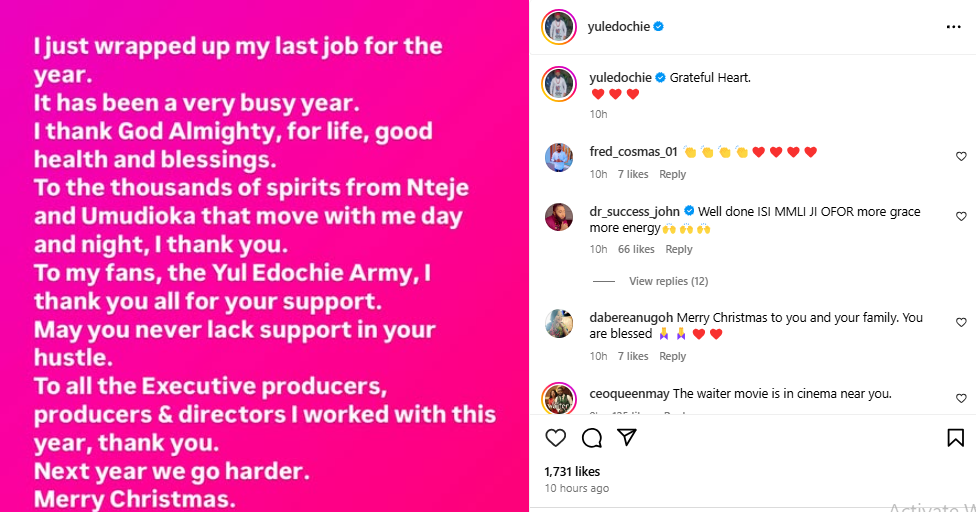Controversial actor, Yul Edochie pens a note of gratitude to the public as he wraps his year up.