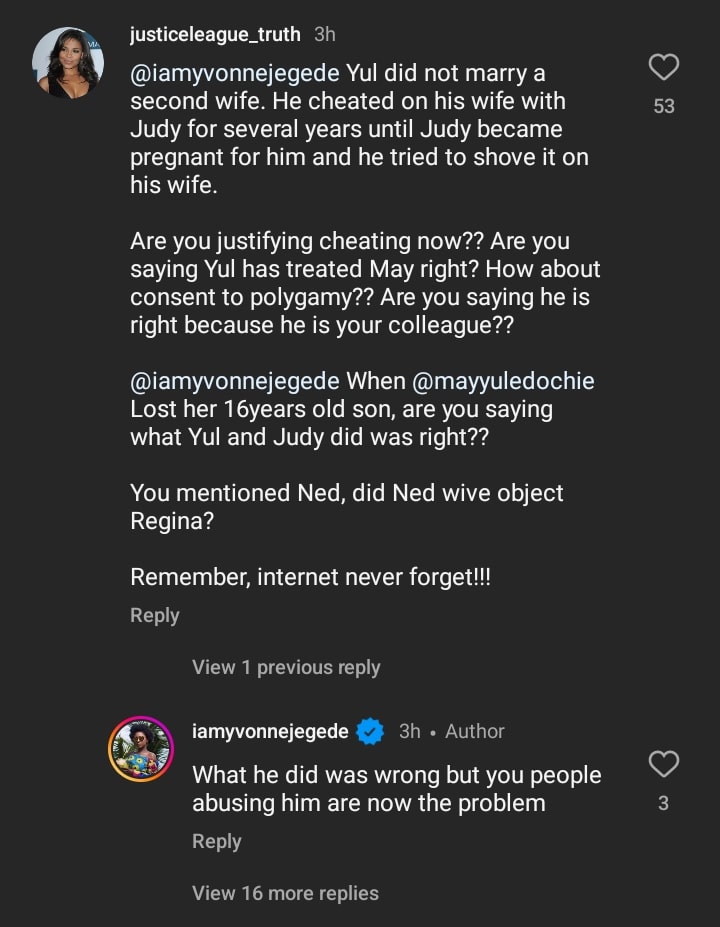 Actress Yvonne Jegede has reacted after some angry netizens stormed her page to drag her for endorsing Yul Edochie’s marriage to Judy Austin.