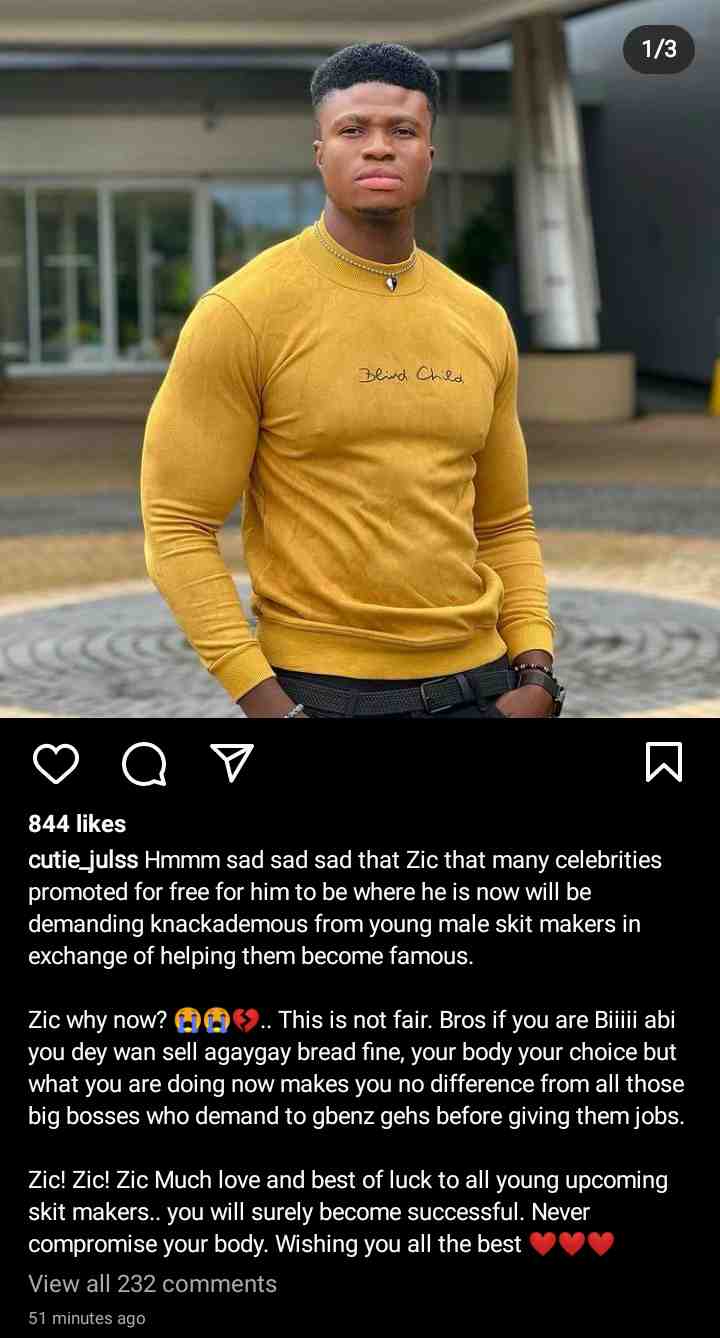 “Hmmm sad sad sad that Zic that many celebrities promoted for free for him to be where he is now will be demanding knackademous from young male skit makers in exchange of helping them become famous.