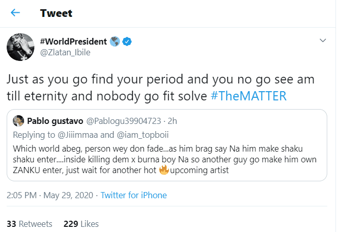 Zlatan replied; “Just as you go find your period and you no go see am till eternity and nobody go fit solve #TheMATTER”